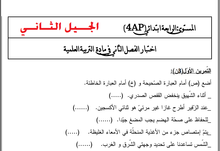 إختبارات التربية العلمية للسنة الرابعة إبتدائي الجيل الثاني مع الحلول الفصل الثاني